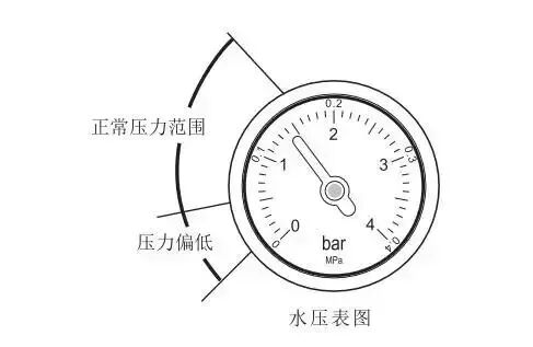 ● 查看壁挂炉的水压表。介于1bar~1.5bar为正常,如果压力过低,则需要补水;